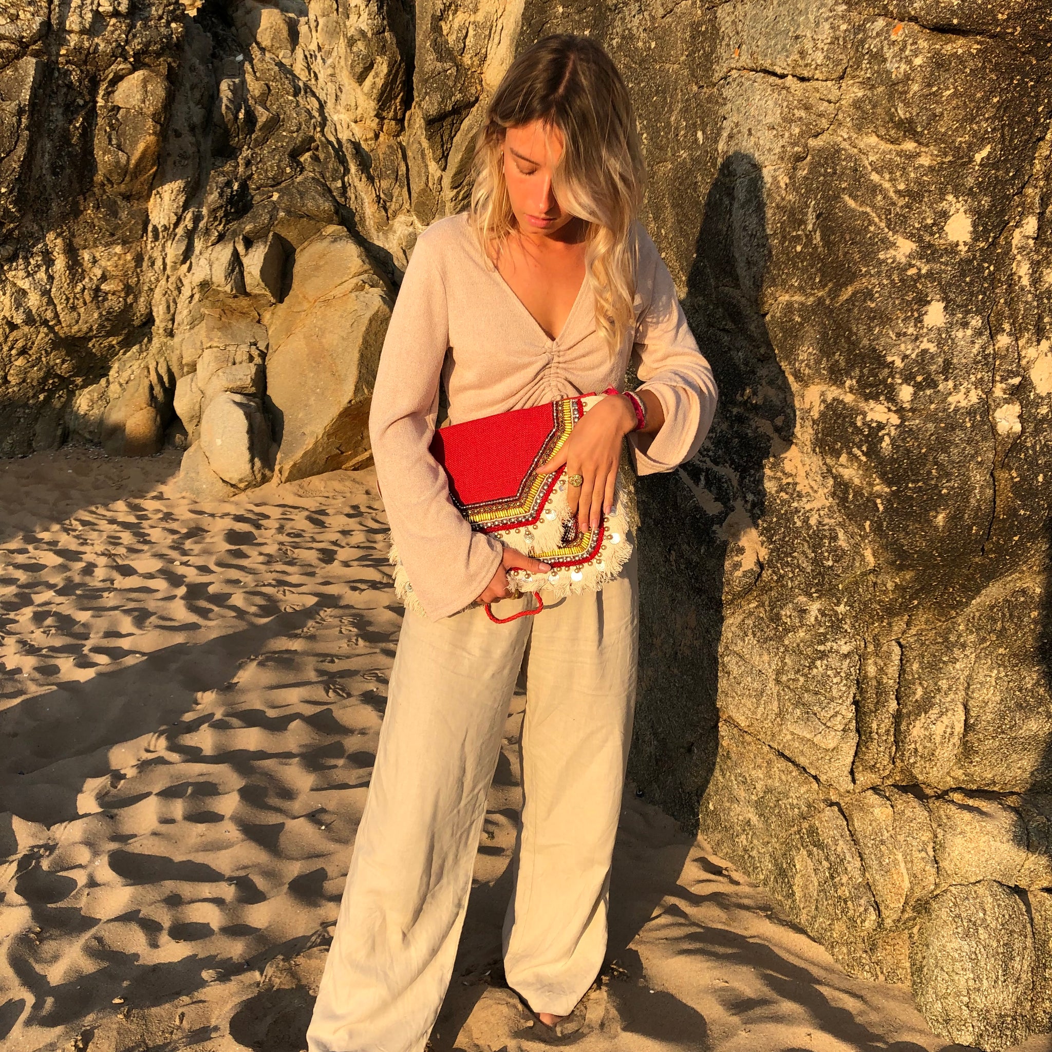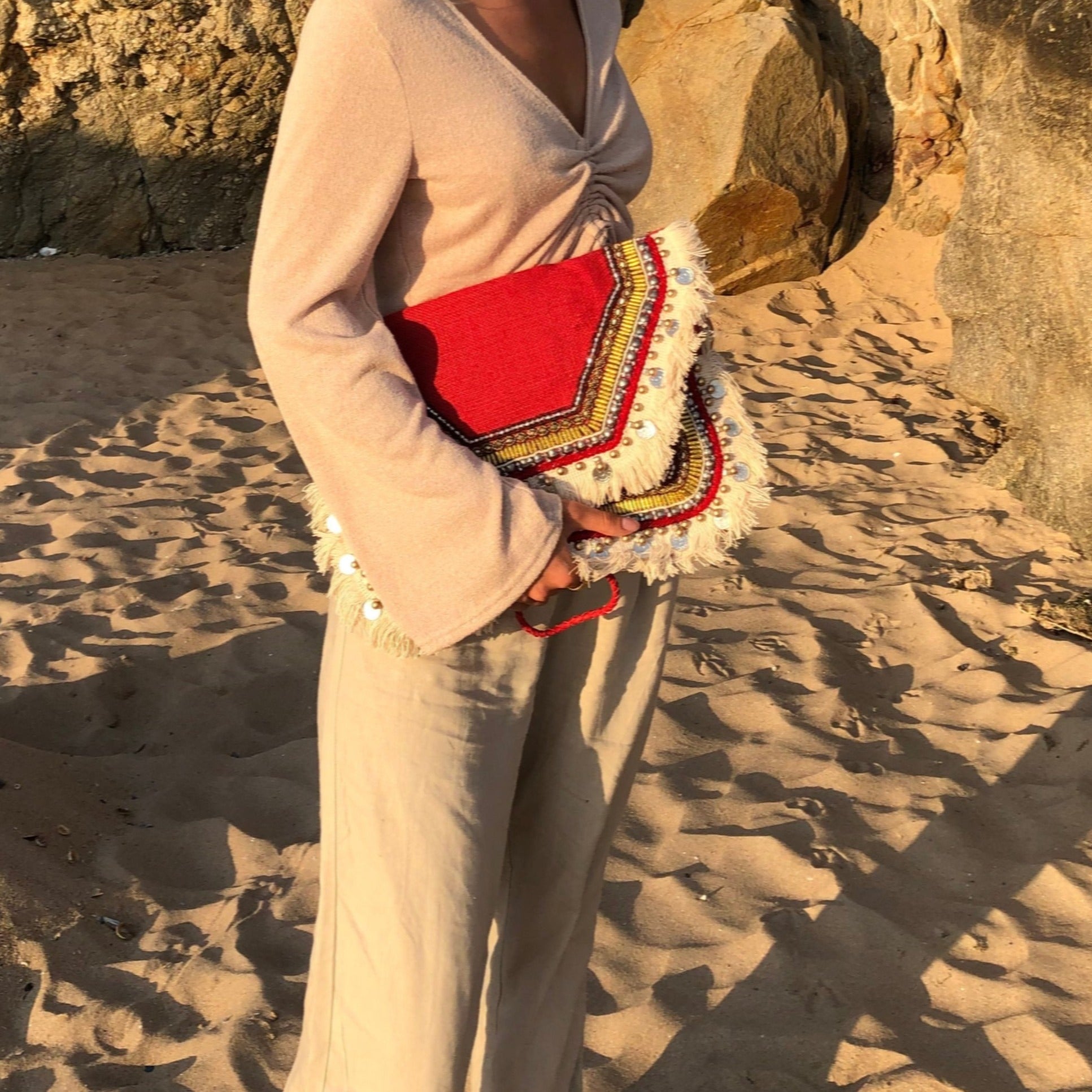 Pochette ethnique rouge à franges et sequins. Breloques et perles brodées à la main. Doublure intérieure en coton. Notre pochette Zohra dispose d'une petite pochette supplémentaire zippée à l'intérieur pour compartimenter vos affaires. Fermeture éclair et bouton pression pour fermer la pochette. Bandoulière tressée en cuir rouge pour la porter sur l'épaule ou en cross-body.