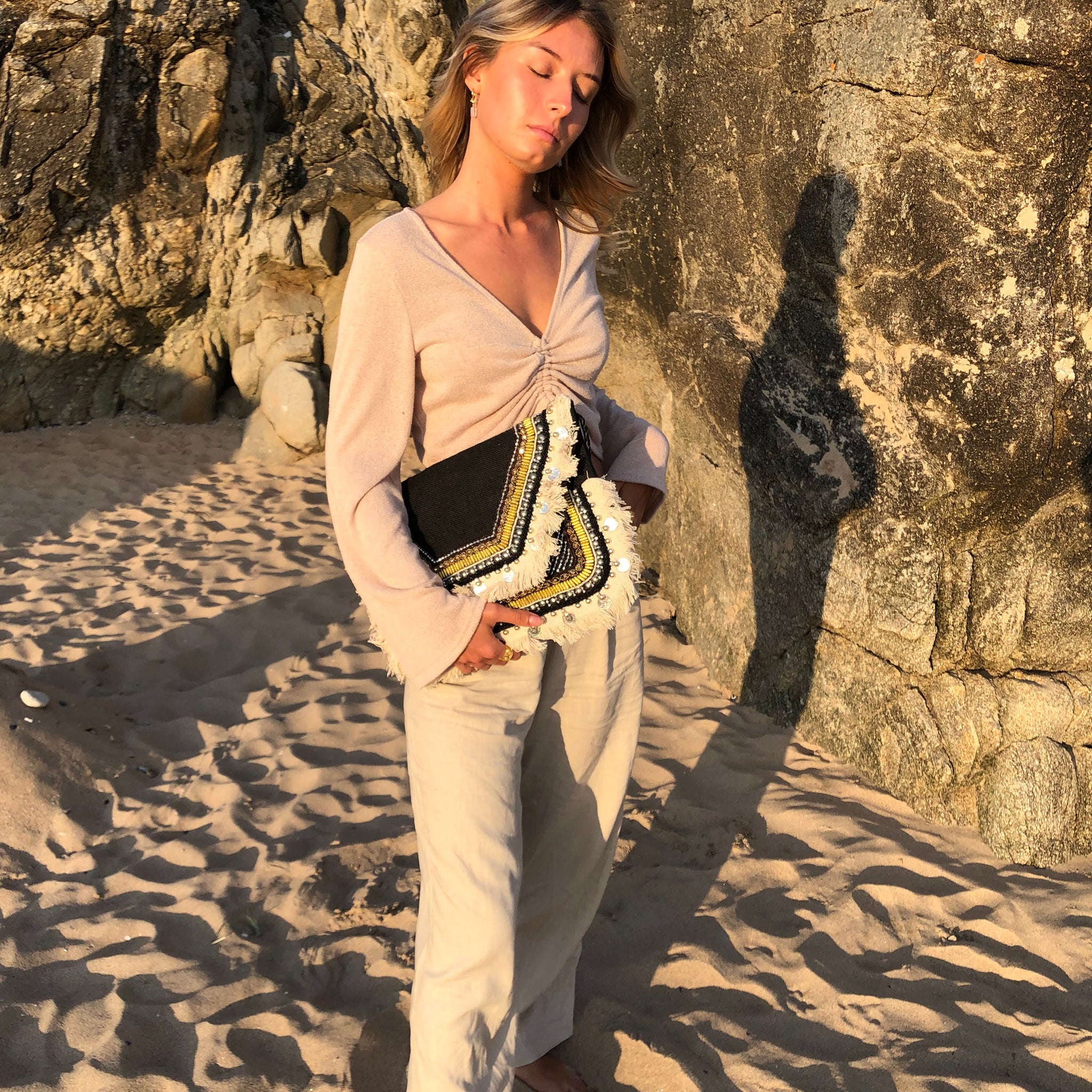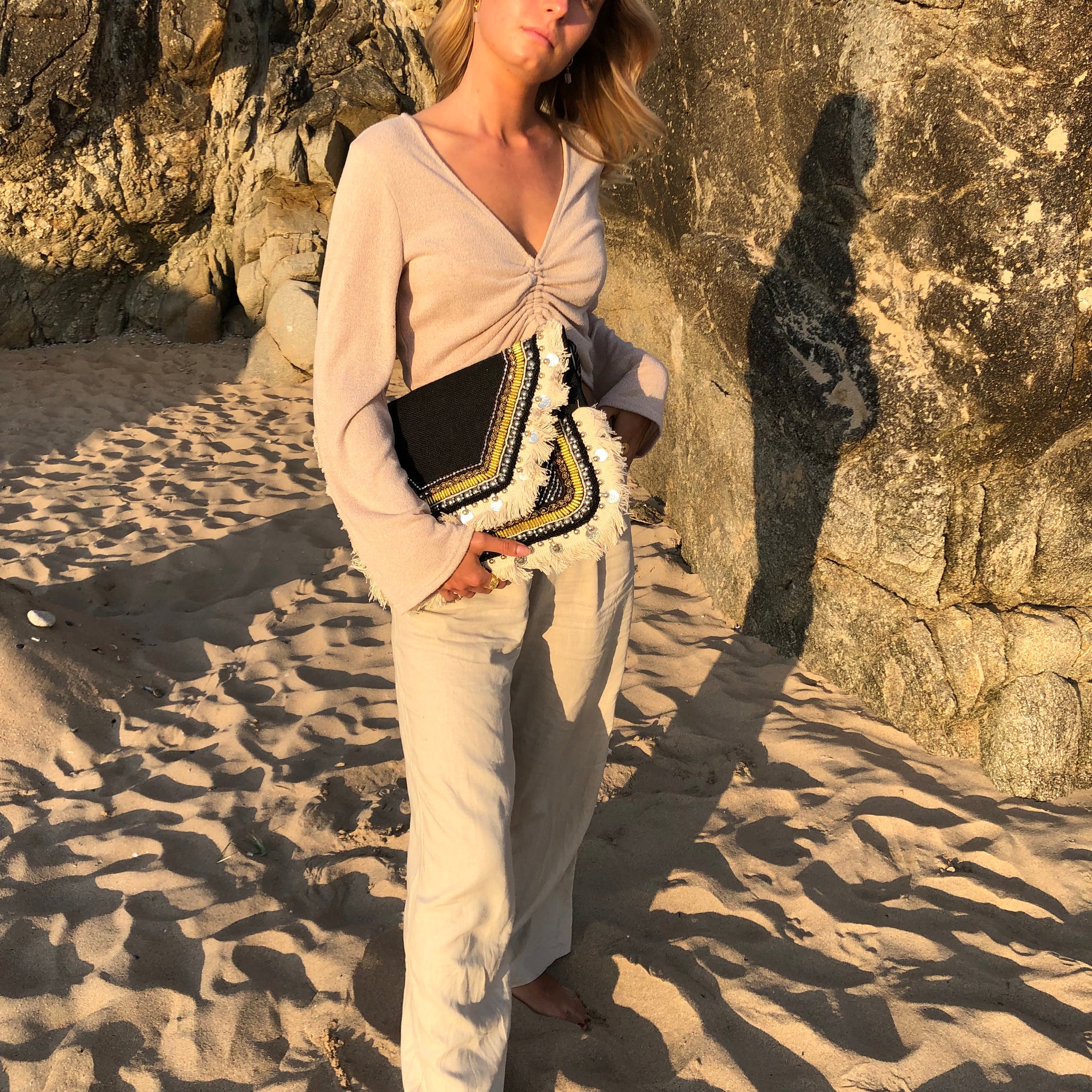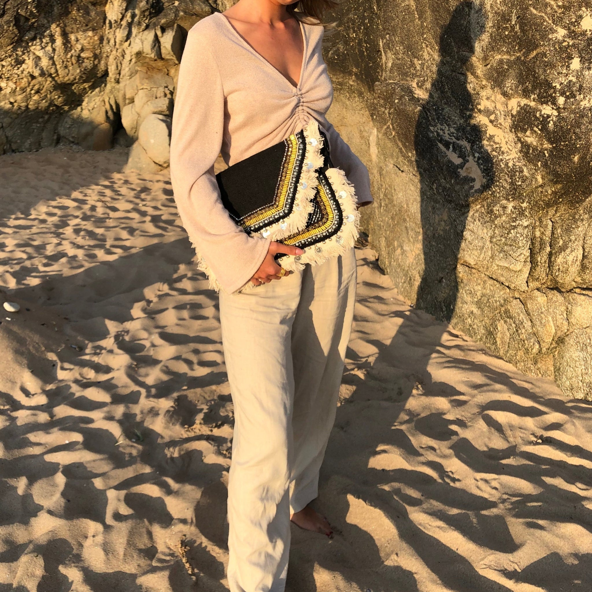 Pochette ethnique noire à franges et sequins. Breloques et perles brodées à la main. Doublure intérieure en coton. Notre pochette Zohra dispose d'une petite pochette supplémentaire zippée à l'intérieur pour compartimenter vos affaires. Fermeture éclair et bouton pression pour fermer la pochette. Bandoulière tressée en cuir rouge pour la porter sur l'épaule ou en cross-body.